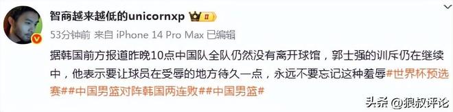 媒体人“王健”发文“韩国前方报道昨晚10点中国队全队仍然没有离开球馆,郭士强的训斥仍在继续中,他表示要让球员在受辱的地方待久一点,永远不要忘记这种羞辱”。